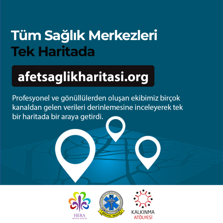 HERA Mobil Sağlık Uygulaması, Medikal Arama ve Kurtarma Derneği ve Kalkınma Atölyesi birlikteliğinde afet bölgesindeki aktif sağlık kuruluşu ve seyyar revirlerin haritalandırma çalışmasını tamamlamış bulunmaktayız