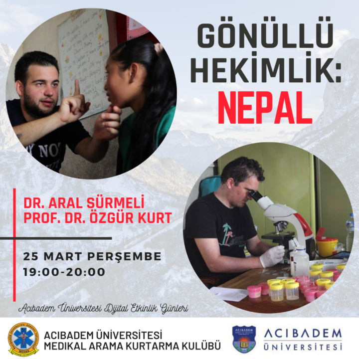 25 Mart Perşembe günü 19:00 – 20:00 arası “Acıbadem Üniversitesi Dijital Etkinlik Günleri”nde “Gönüllü Hekimlik: Nepal” ile sizlerleyiz! MEDAK Başkanı Dr. Aral Sürmeli ve Prof. Dr. Özgür Kurt; MEDAK’la birlikte başlayan dünyanın en fakir ülkelerinden birisi olan Nepal'deki maceralarını anlattığı etkinliğimize hepinizi bekliyoruz. Etkinliğimiz herkese açıktır. Etkinlik linki: https://zoom.us/j/96765074999