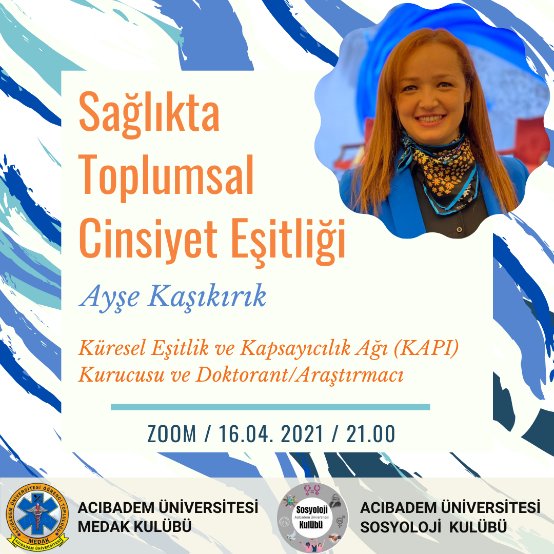Acıbadem Mehmet Ali Aydınlar Üniversitesi MEDAK ve Sosyoloji Kulüpleri, "Sağlıkta Toplumsal Cinsiyet Eşitliği" konu başlığı ile 16 Nisan 2021 Cuma günü saat 21.00’de Zoom'da, Küresel Eşitlik ve Kapsayıcılık Ağı (KAPI) Kurucusu ve Doktorant/Araştırmacı Ayşe Kaşıkırık'ı ağırlıyor. Toplumsal cinsiyet rol ve beklentilerinin etki ettiği ve beraberinde getirdiği eşitsizliğe neden olan alanlardan birisi de sağlıktır. Bu etkinliğin temelinde, hem sağlık alanında kariyer yapmak isteyen kadınların karşısına çıkan engellere hem de sosyal sorun…