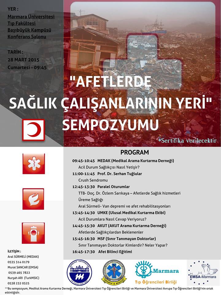 Ülkemiz afetlerin sık yaşandığı bir coğrafyada bulunmaktadır. Birçok afetin, özellikle depremlerin etkileri hala daha devam etmektedir. Bu konuda çalışan birçok gönüllü kuruluş olmasına rağmen, sağlık çalışanlarının bu konuda yeterli kapasitede olmadığını düşünmekteyiz. Bu boşluğu doldurmak adına birçok çalışma yürüten MEDAK olarak, bu sefer de afetlerde çalışan sağlık ekiplerini bir araya getirdik. Bir sağlık çalışanının afetlerde rolü nedir? Nasıl eğitimler almış olmalıdır? Saha gerçekten de hastaneden o kadar farklı mı? Ve bu konuda çalışan ekipler neler yapıyor? Sempozyumumuzda bu sorular üzerine yoğunlaştık.MEDAK, DSÖ( Dünya Sağlık Örgütü), UMKE (Ulusal Medikal Kurtarma Ekibi), AKUT (AKUT Arama Kurtarma Derneği), TTB (Türk Tabipler Birliği), MSF (Sınır Tanımayan Doktorlar) gibi kuruluşlar konuşma yaparak afetleri kendi objektiflerinden anlattılar.